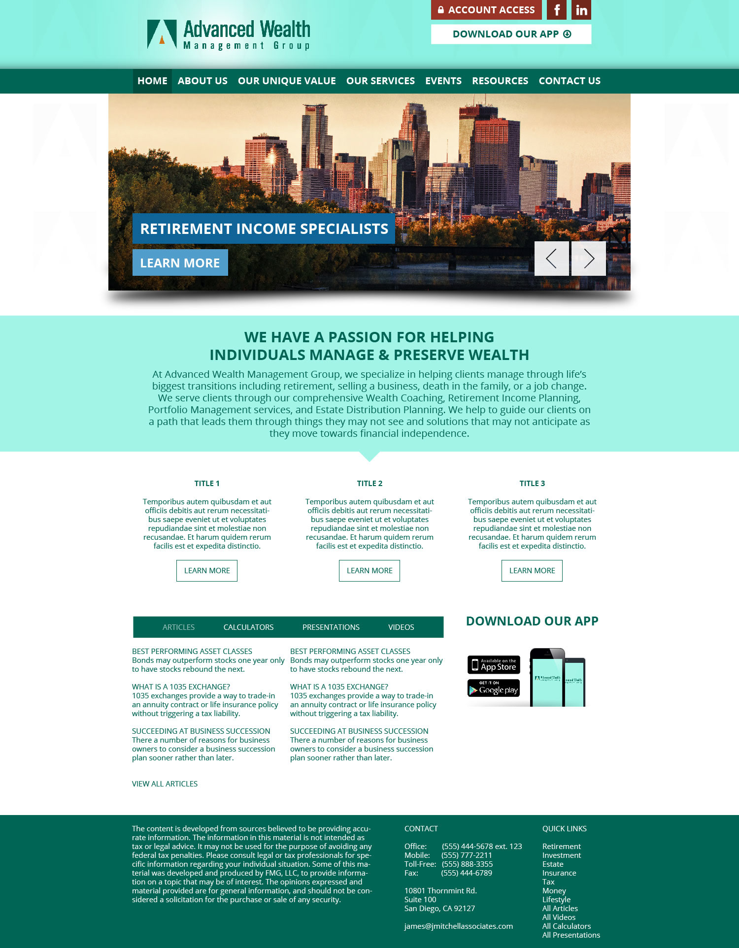Web design for Advanced Wealth Management. In charge of the development of this site's design and mark-up. Designed using Adobe's Illustrator. Coded design using html5, css3 and jquery technologies.