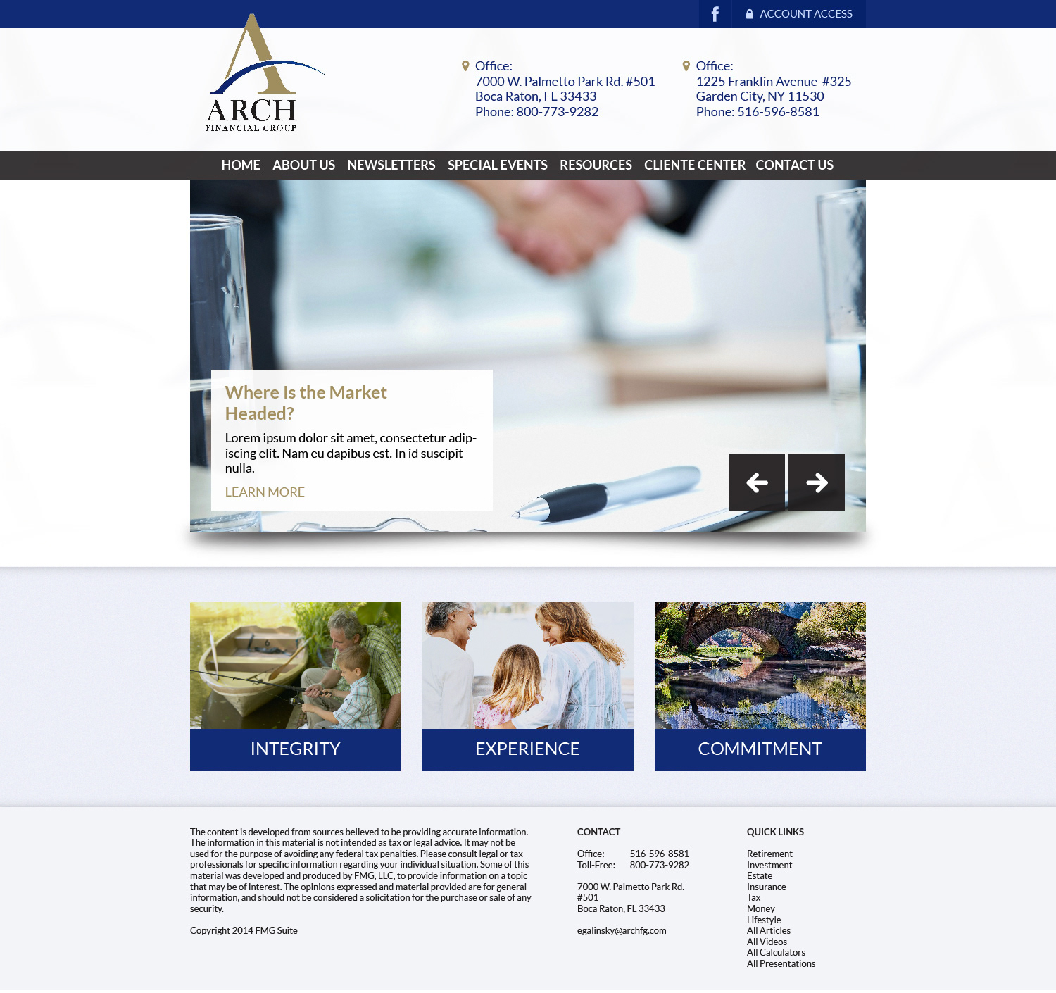 Web design for Arch Financial Group. In charge of the development of this site's design and mark-up. Designed using Adobe's Illustrator. Coded design using html5, css3 and jquery technologies.
