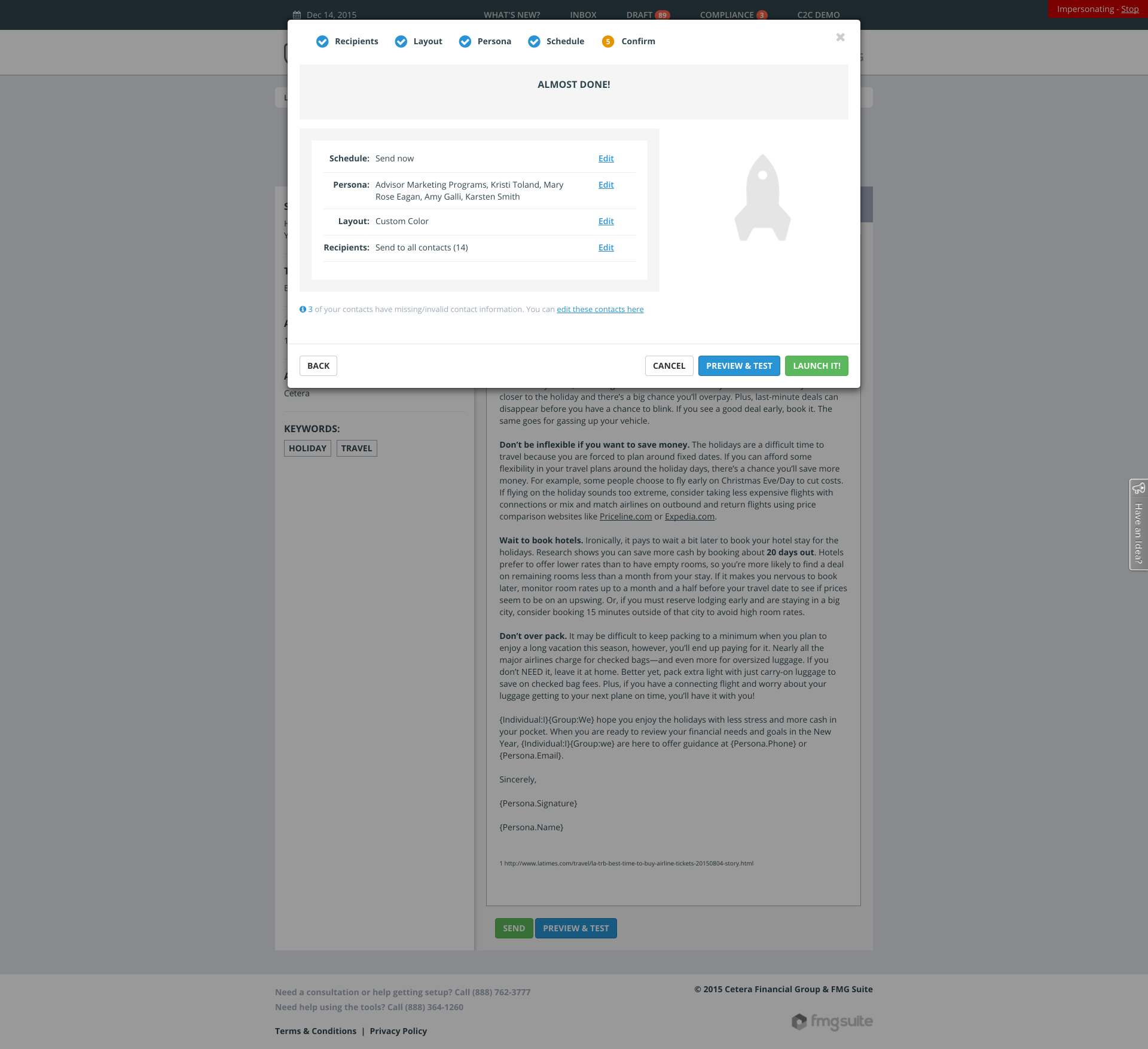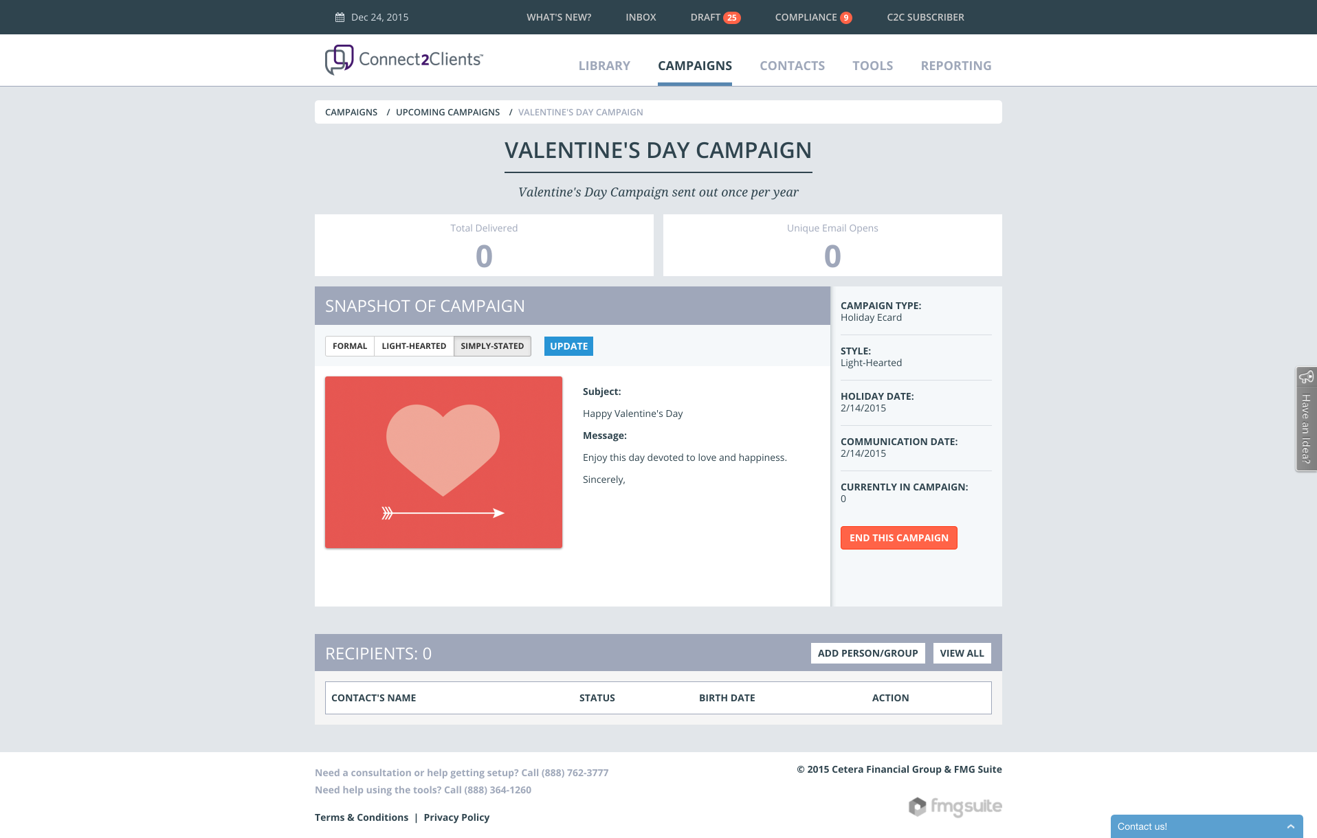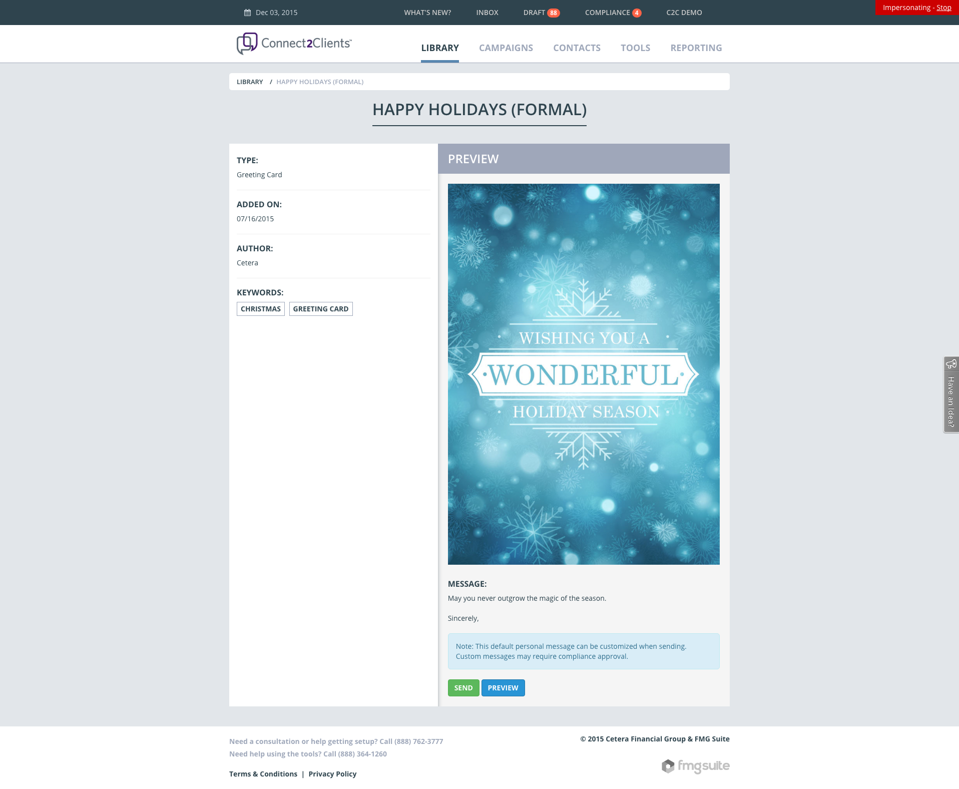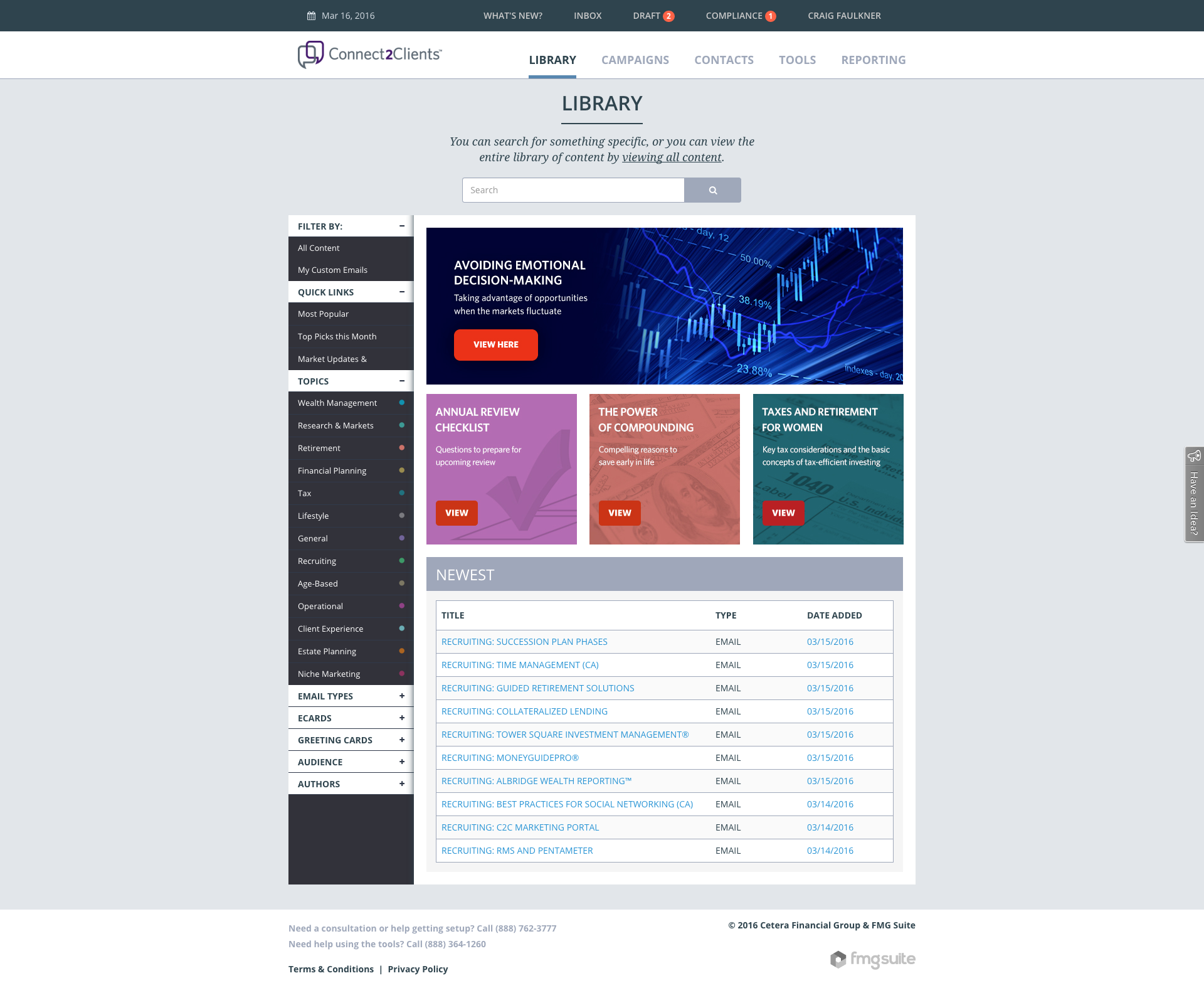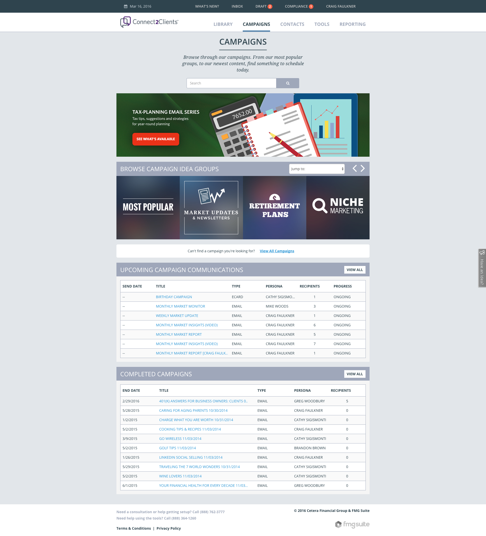Designed the Connect2Clients admin interface, in which financial advisors are able to user these powerful marketing tools to get in touch with their clients through email campaigns, card campaigns, and more.