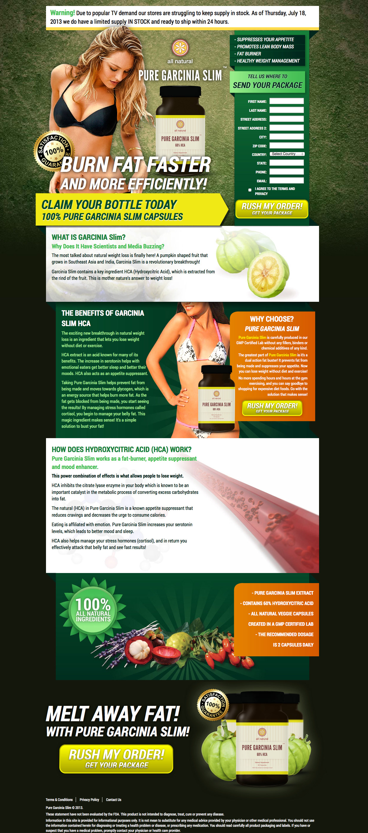 Web design for Pure Garcinia Slim product. In charge of the logo creation, label creation, web site design and web site development. Created all images and graphics on this site from scratch using adobe's illustrator and photoshop.