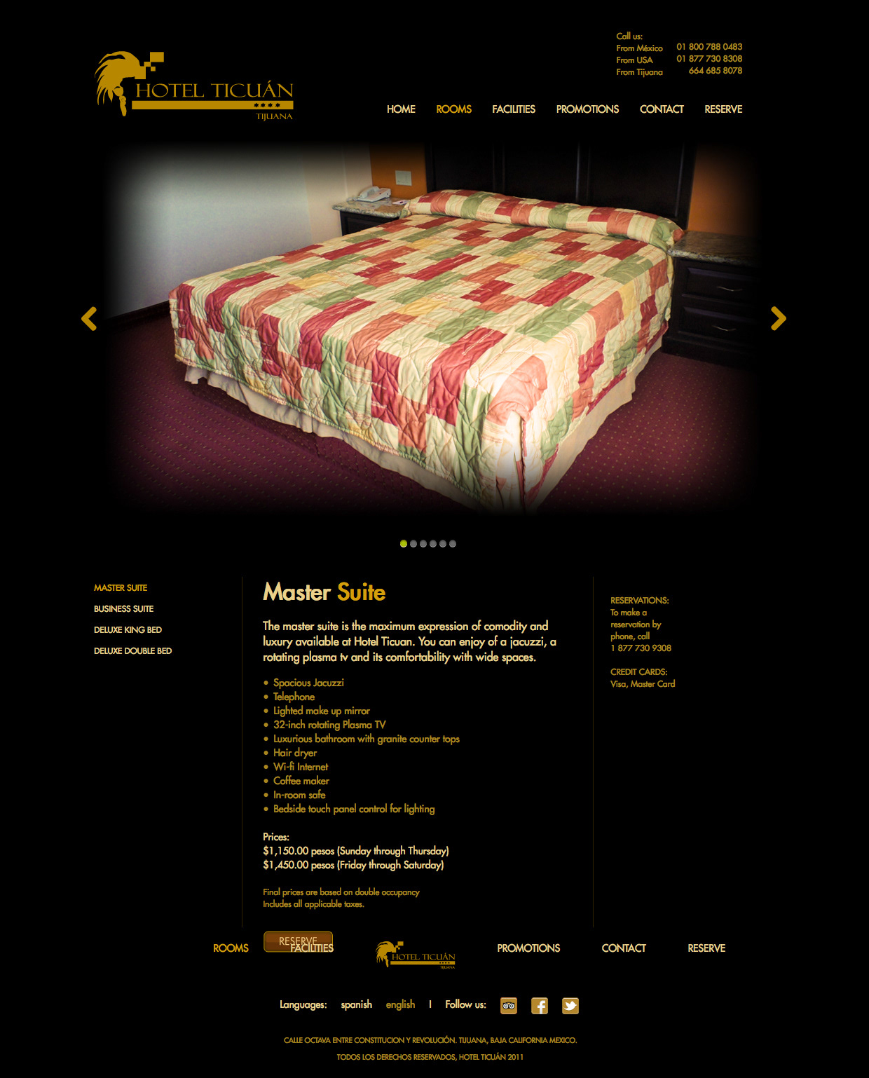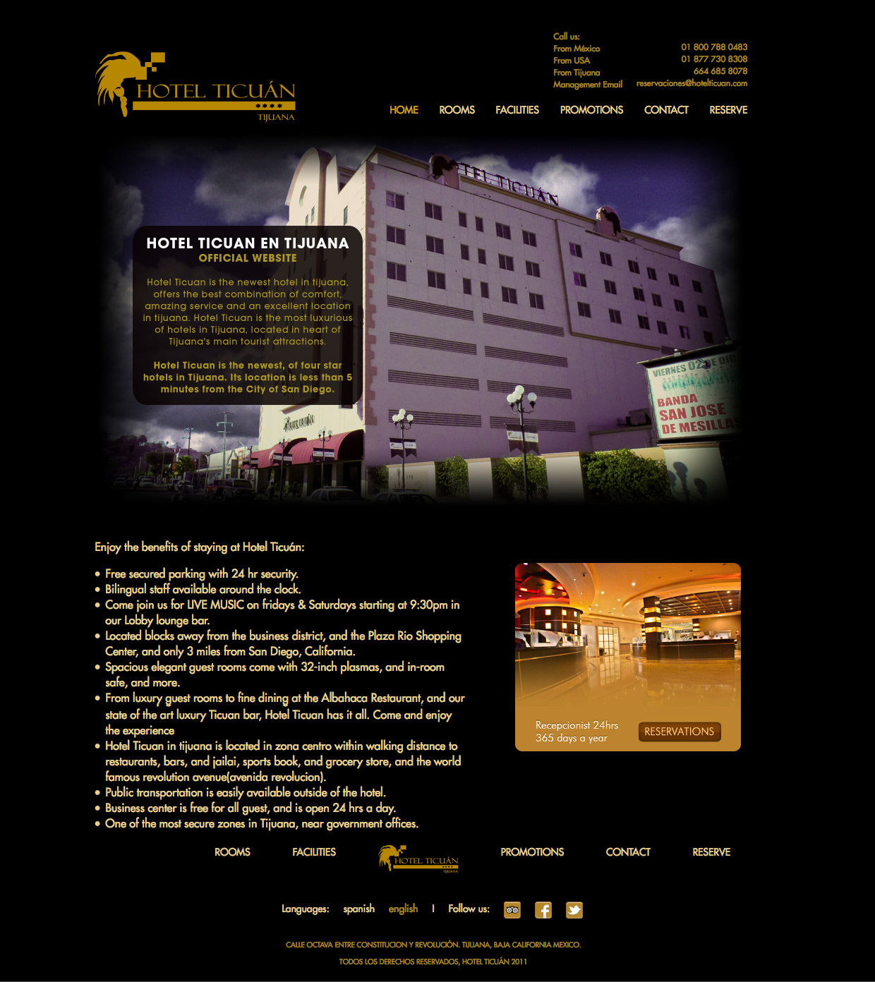 Web design for Ticuan Hotel. In charge of creating a compelling and elegant design for this beautiful hotel. Created design in illustrator and photoshop, used html and css to code the site, and added jquery sliders.